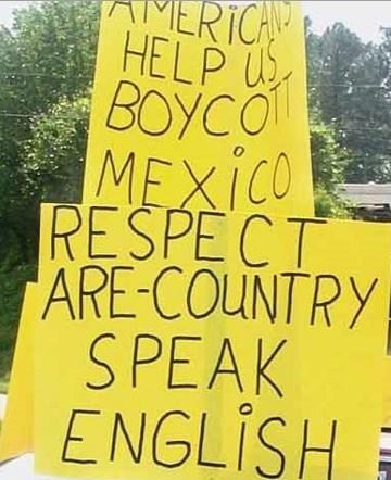 Handwritten sign saying “Respect are [sic] country – speak English”